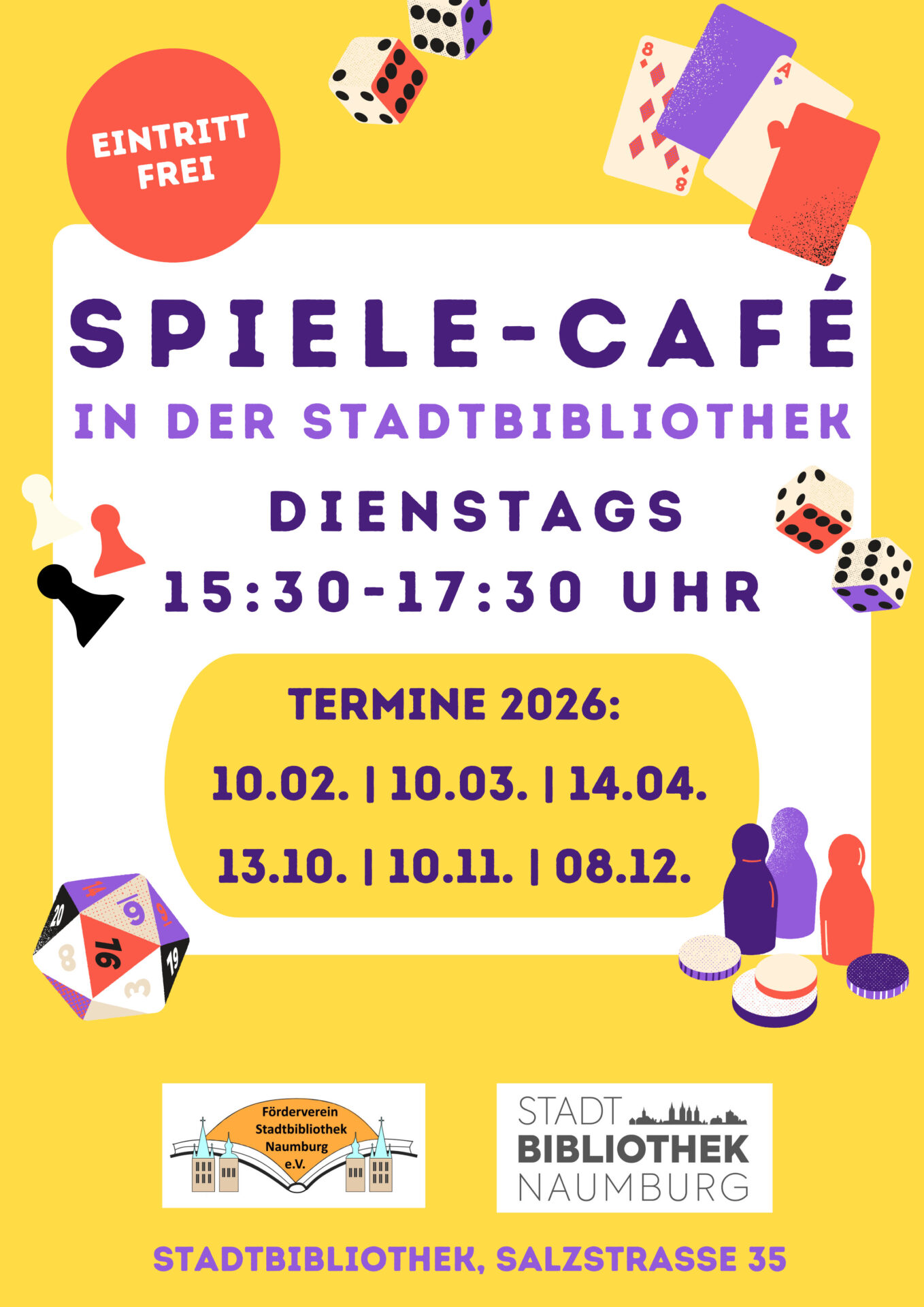 Lust auf Gesellschaftsspiele und nette Begegnungen? Im Spiele-Café der Stadtbibliothek sind alle willkommen – egal ob jung oder alt! Einmal im Monat treffen sich hier Menschen, die Freude an Brett- und Kartenspielen haben und gemeinsam neue sowie klassische Spiele entdecken möchten.